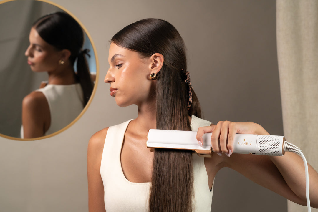 LUNÉA Airflow narovnáva a suší zároveň – bez pálenia, bez potreby viacerých prístrojov. Šetrí čas, energiu aj tvoje vlasy.